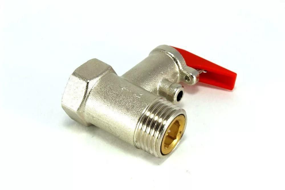 Предохранительный клапан бойлера с флажком для принудительного сброса воды, материал корпуса латунь с никелированием, диаметр подключения 1/2“х1/2“ НВ по направлению потока на корпусе, рабочее давление 10 бар, давление на срабатывание свыше 6 бар, максимальная рабочая температура 120 °С