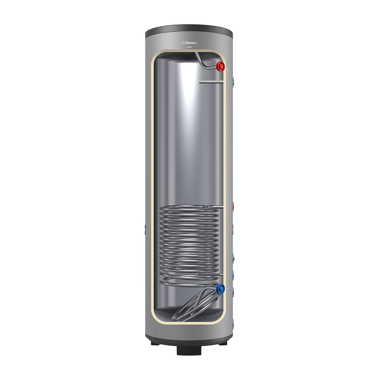 Один водонагреватель – два варианта нагрева. Водонагреватель косвенного нагрева Nixen осуществляет нагрев за счет тепла системы отопления. Внутри установлен теплообменник из нержавеющей стали: модели объемом 150 и 200 литров оснащены теплообменниками мощностью 17 000 Вт, 250 литров – 19 000 Вт и 300 литров – 24 000 Вт. Дополнительно можно установить нагревательный элемент мощностью 6 000 Вт, а также панель управления. Таким образом, Thermex Nixen можно эксплуатировать как водонагреватель с косвенным нагревом или превратить его в бойлер комбинированного типа.